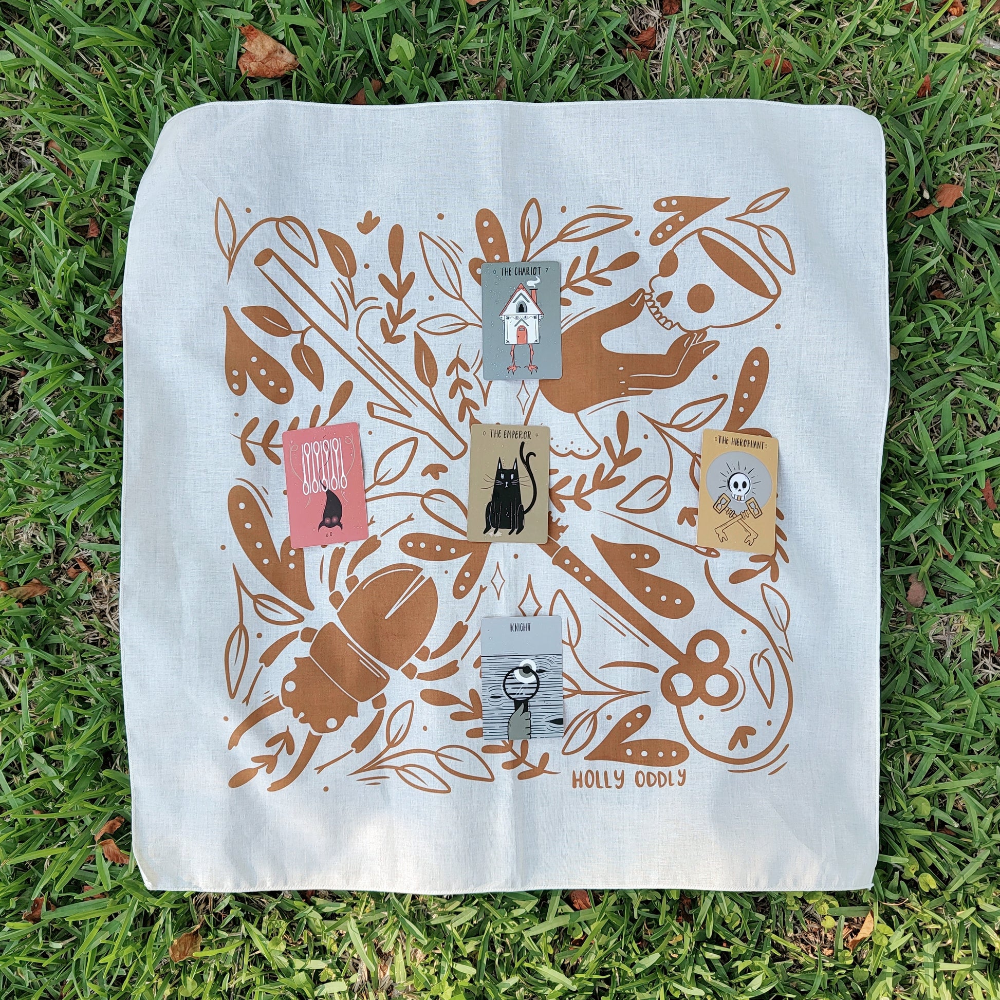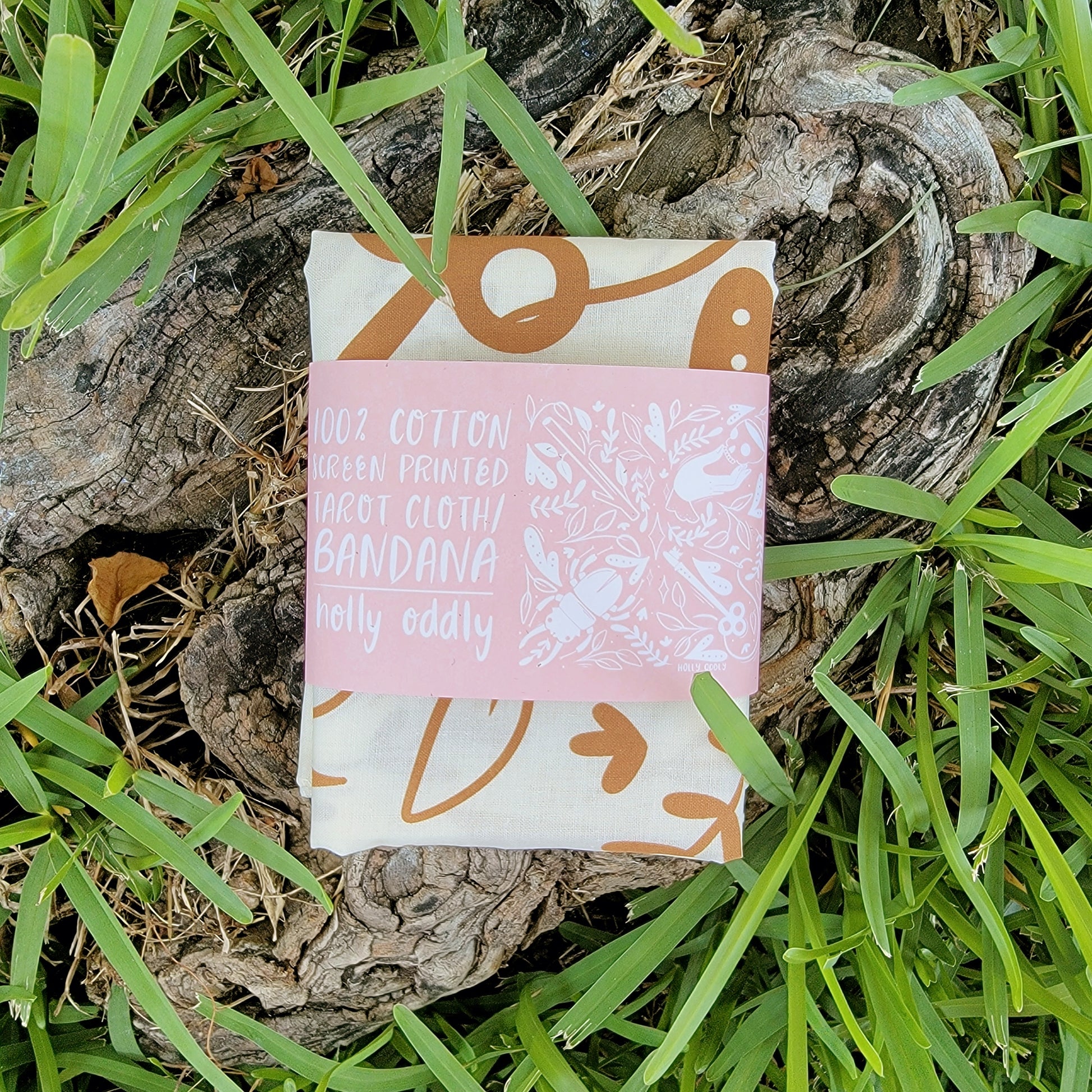 I've been wanting to design a tarot cloth for so long, and it is here! This cloth, which is also a bandana, is 22x22 inch, made of 100%, light-weight cotton, and is screen printed in California. The packaging is a 100% recycled belly band that shows the full design. Bandanas are so versatile, which is why I wanted to make my tarot cloth from them! You can use it as a clean space for your tarot reading, make a no sew tarot bag to carry your cards in (directions on inside flap of belly band!), wear it around your neck, or as a headband!