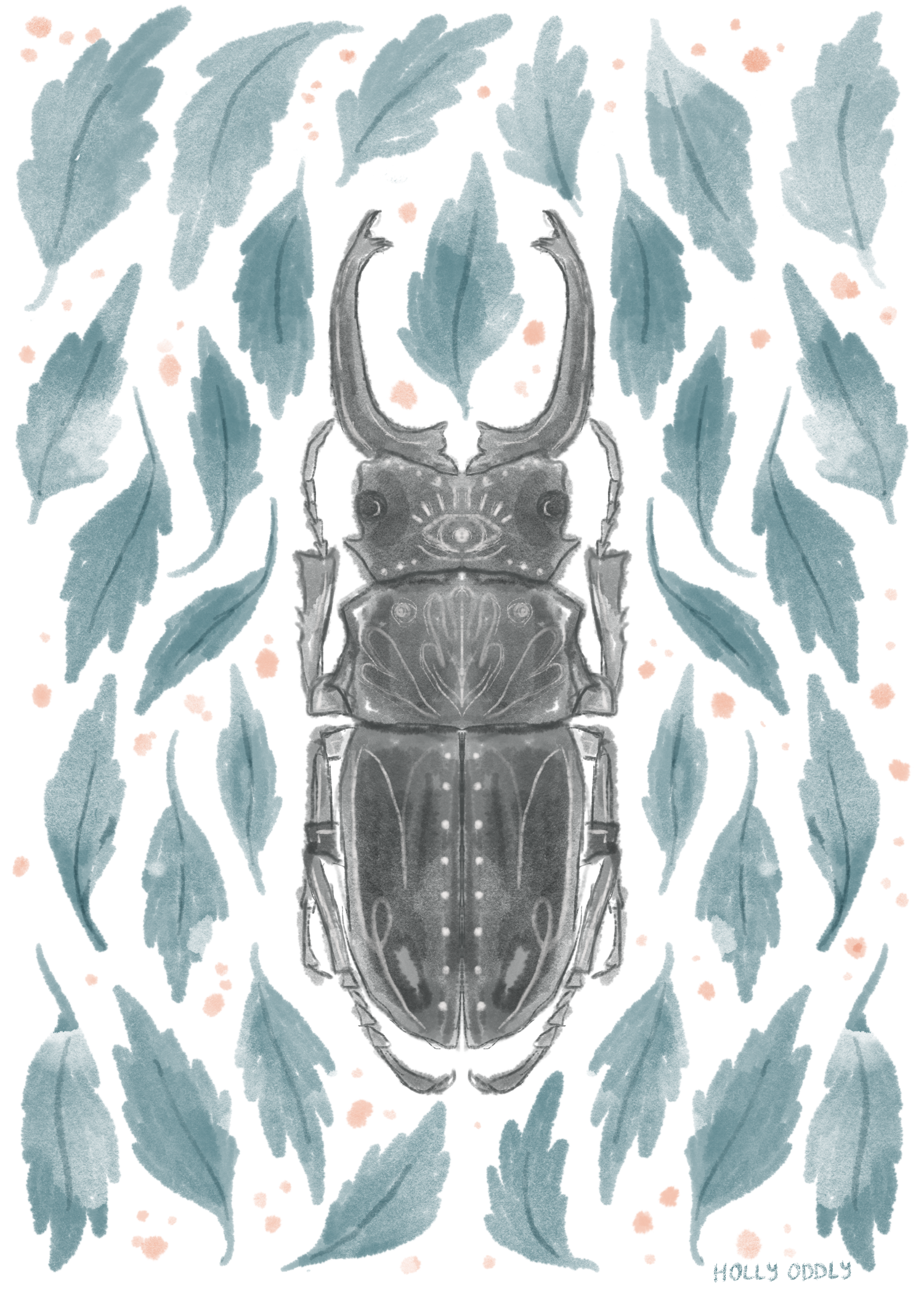 This 5x7 Beetle Art Print features a mysterious stag beetle surrounded by blue leaves, adding a quirky and mystical touch to any space.