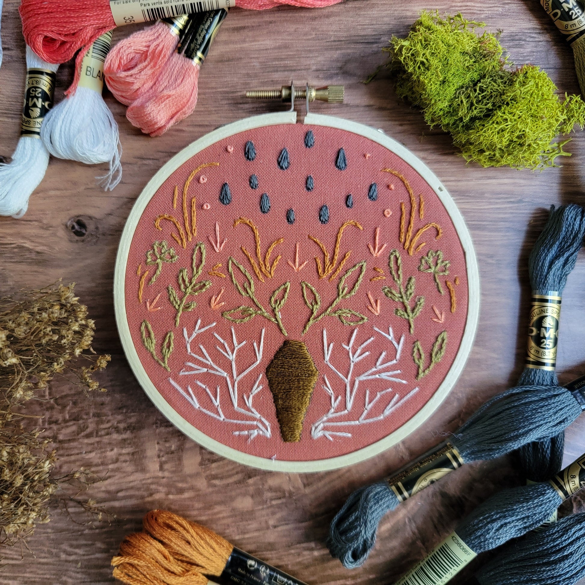 Comes with: printed cloth pattern, needle, 4 inch wooden hoop, 6 colors of embroidery floss (shades vary based on availability), backer for hoop, and a video tutorial