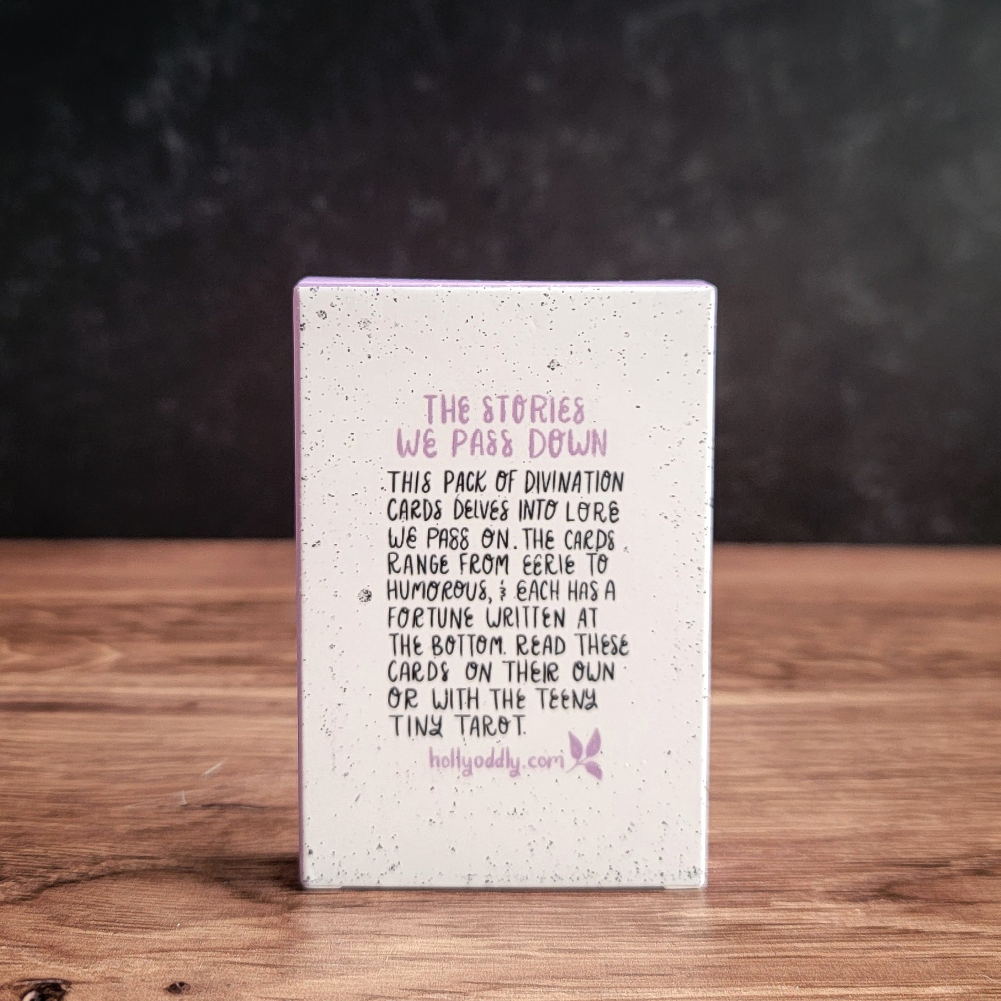 The Mini Divi cards are 58x88mm cards on 300gsm that are perfect for taking with you. It is great for using with other Mini Divi decks in one giant mega Mini Divi or with the Teeny Tiny Tarot. It is a 30-card deck with a purple, black, and white color palette. The interpretations are directly on the cards, so there is no need for a guide.