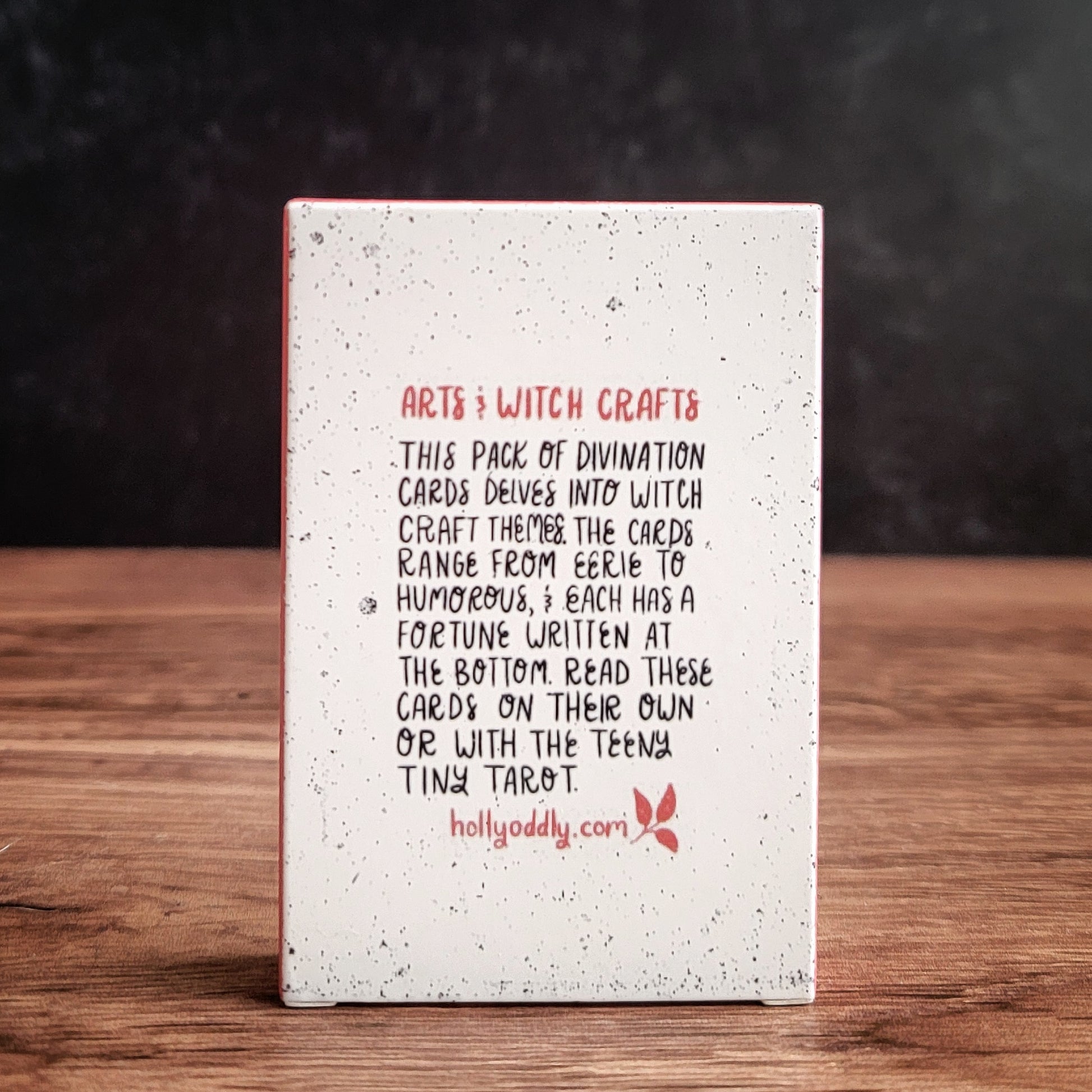 The Mini Divi cards are 58x88mm cards on 300gsm that are perfect for taking with you. It is great for using with other Mini Divi decks in one giant mega Mini Divi or with the Teeny Tiny Tarot. It is a 30-card deck with a purple, black, and white color palette. The interpretations are directly on the cards, so there is no need for a guide.